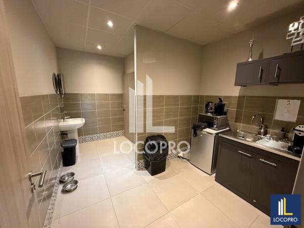 Le bureau, aménagé en open space, bénéficie d'une lumière naturelle abondante et d'une climatisation assurant un confort optimal tout au long de la journée. Il est également équipé d'une connexion fibre optique performante, indispensable pour les activités professionnelles nécessitant un accès internet rapide et stable. Les espaces communs de l'immeuble incluent un sanitaire et un coin kitchenette, pratiques pour le quotidien des occupants.