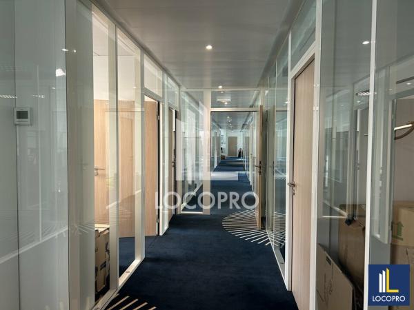 La surface développée est d'environ 400 m² et se présente sous la forme d'un plateau déjà aménagé, cloisonné et prêt à l'emploi. L'organisation intérieure a été pensée pour répondre aux standards actuels des entreprises, avec des espaces rationnels et confortables. Les sols en moquette assurent un bon confort acoustique et participent à une atmosphère de travail agréable. L'ensemble est en bon état général et ne nécessite pas de travaux lourds avant installation.