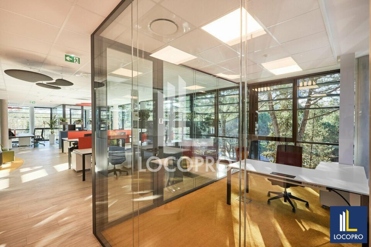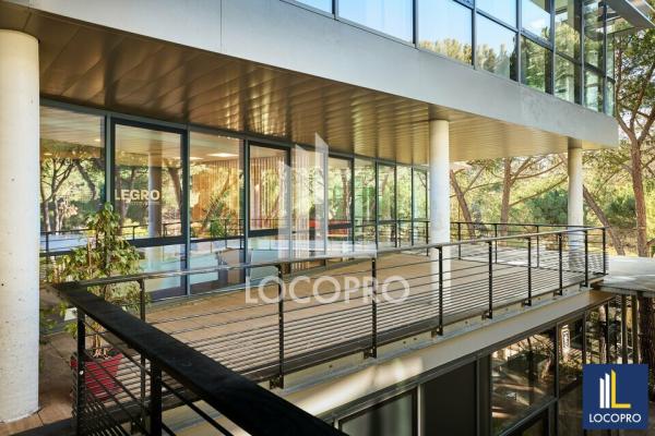Le plateau est déjà cloisonné et comprend des bureaux individuels, des espaces de travail ouverts ainsi qu'une cuisine équipée. Les sanitaires sont situés sur le pallier, garantissant un usage pratique pour l'ensemble des collaborateurs. Deux terrasses privatives viennent compléter ce bien, offrant des zones extérieures pour les pauses ou des réunions informelles, un atout rare pour un bureau en technopole.
