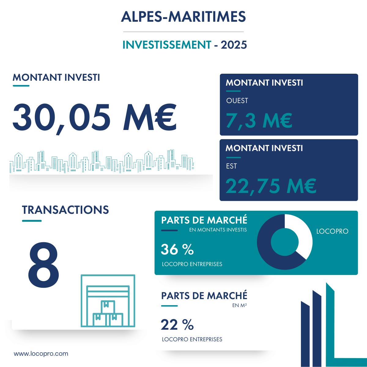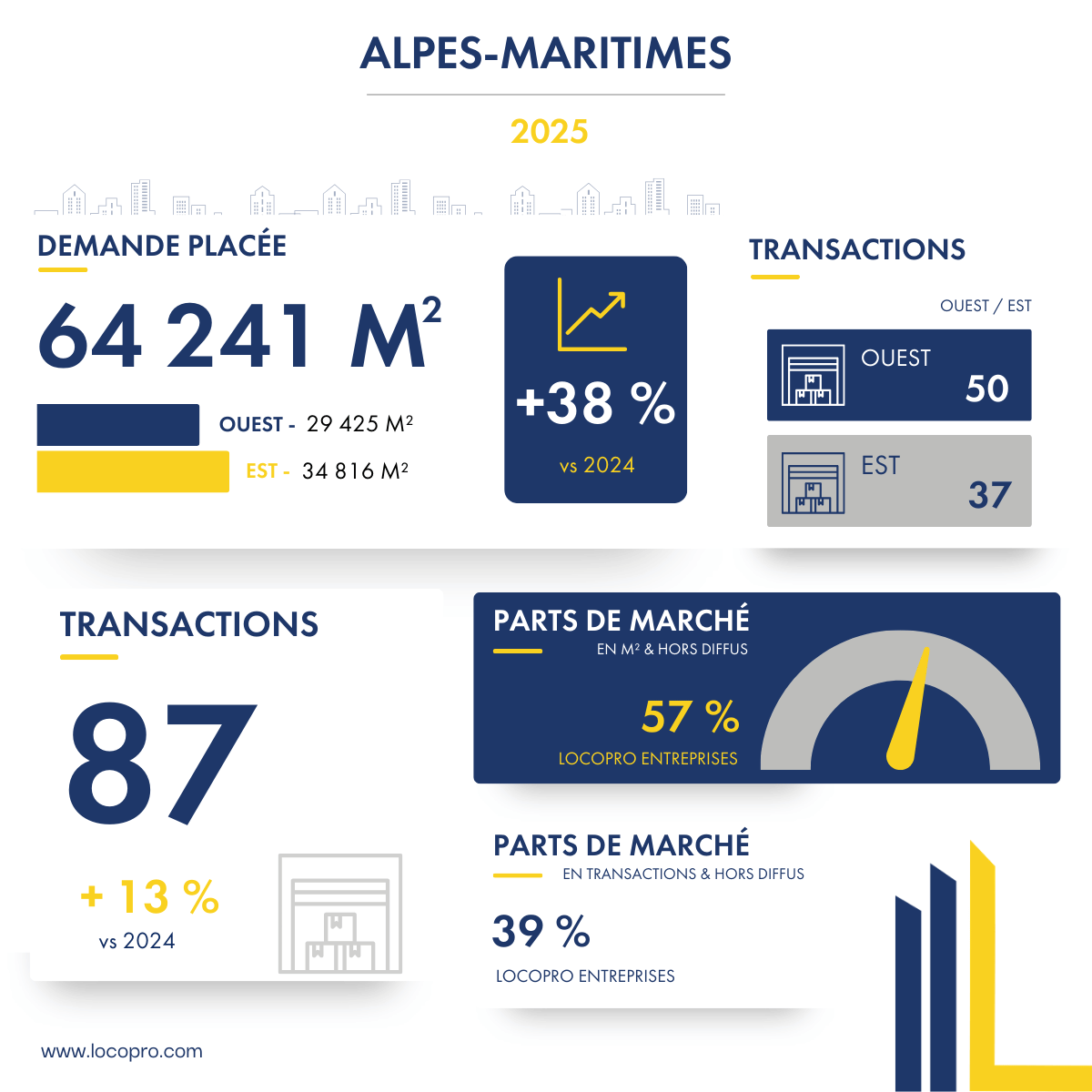 Les Alpes-Maritimes s’affirment comme un pôle économique et logistique dynamique, avec une croissance soutenue du marché des locaux d’activités et entrepôts. Locopro Entreprises, grâce à son savoir-faire et sa connaissance fine du territoire, accompagne les entreprises dans la réalisation de leurs projets immobiliers, en leur offrant des solutions sur mesure et performantes.