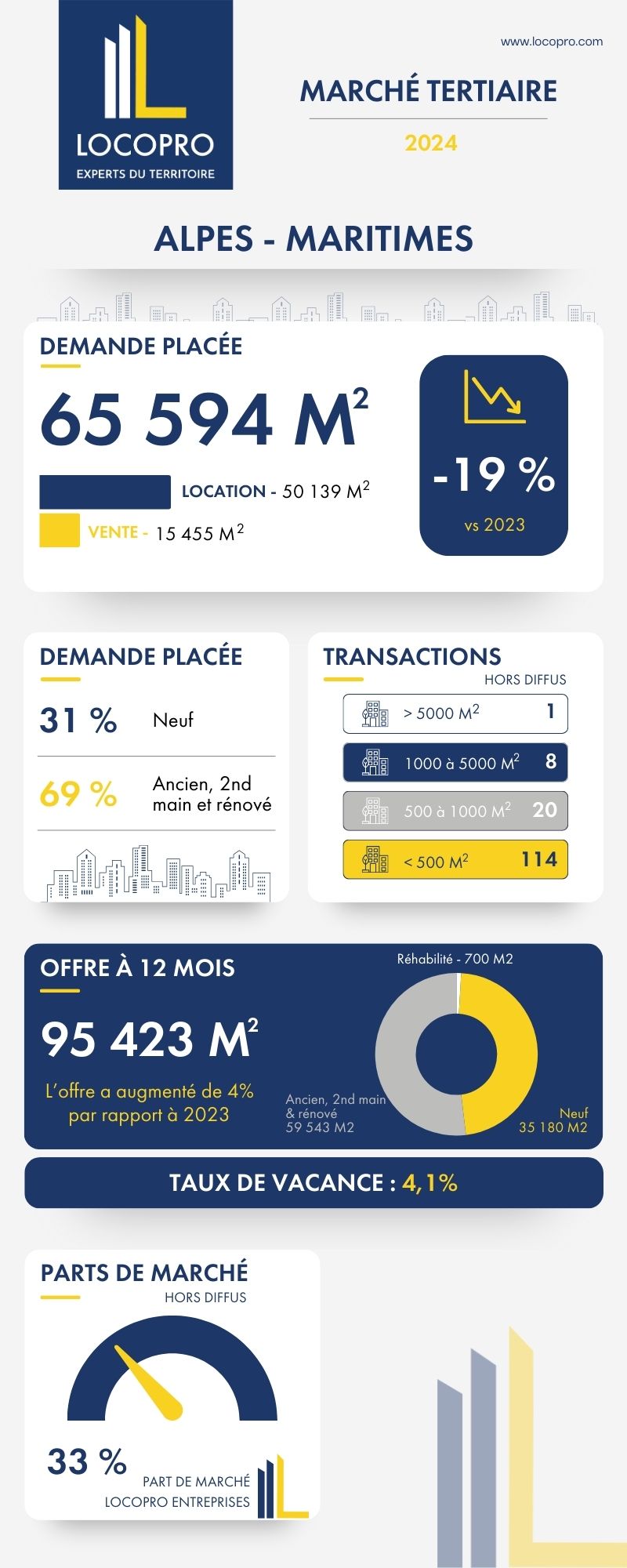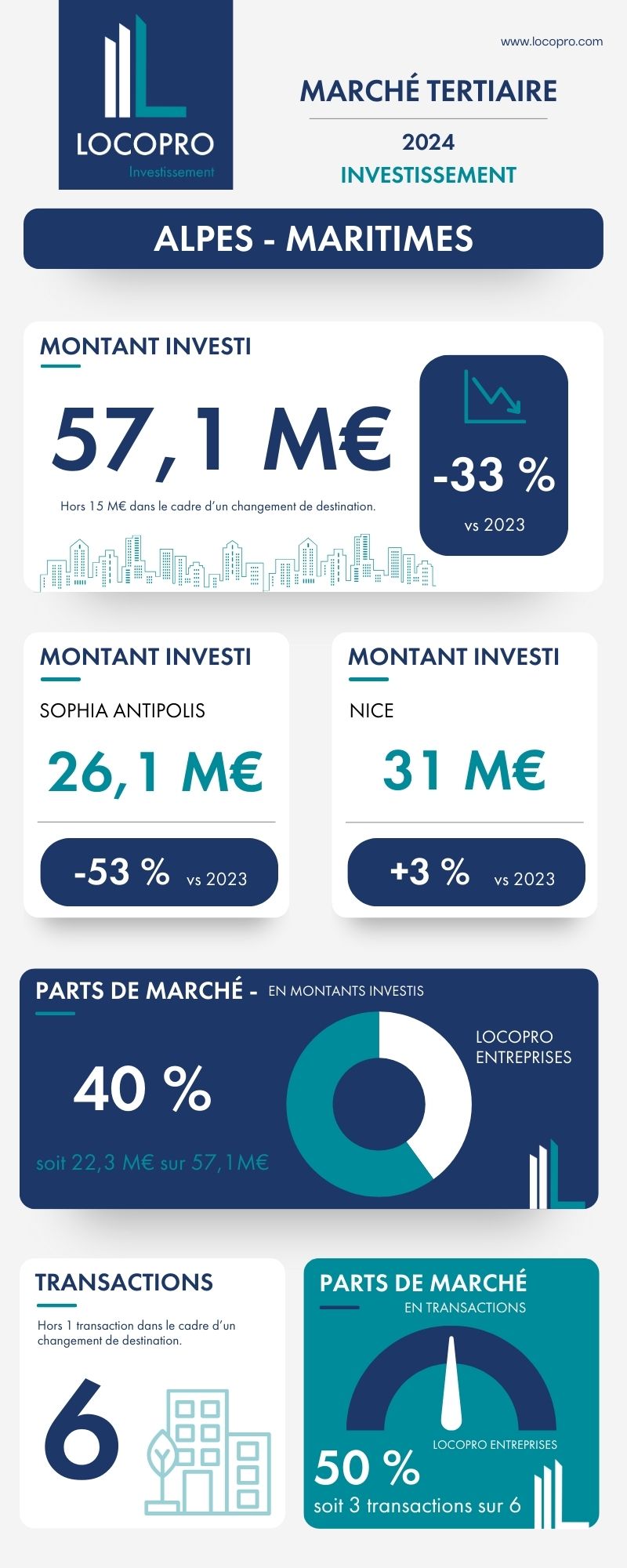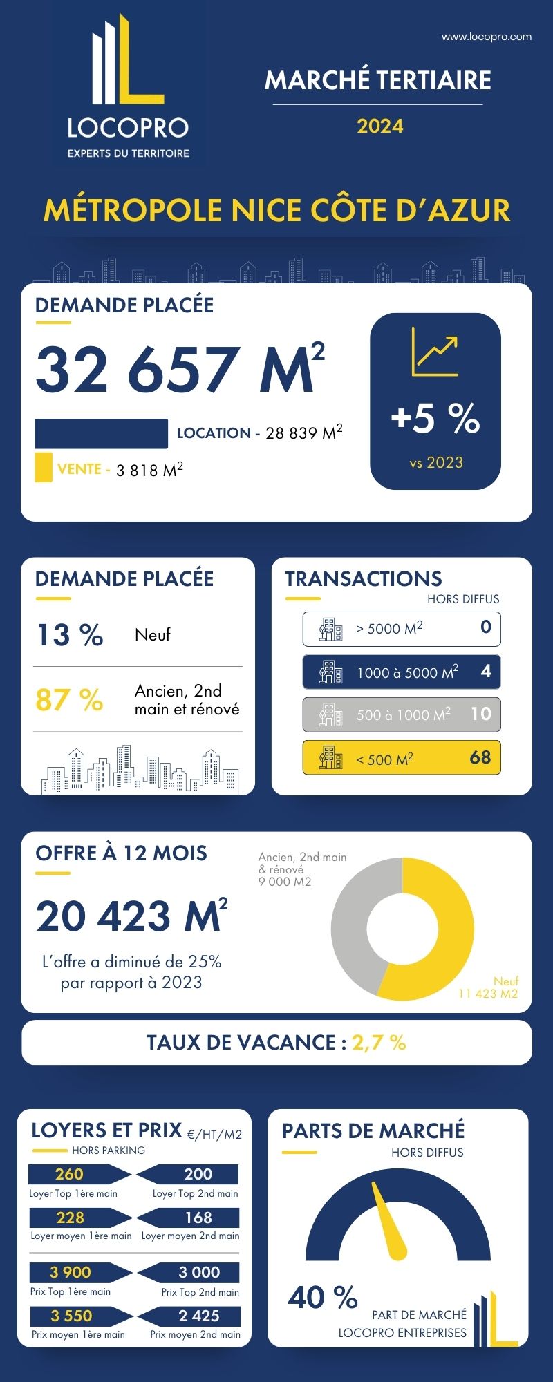 Avec 40% de part de marché (hors diffus) sur les bureaux de Métropole Nice Côte d'Azur, cette année encore, notre cabinet se positionne comme le leader du marché tertiaire niçois.