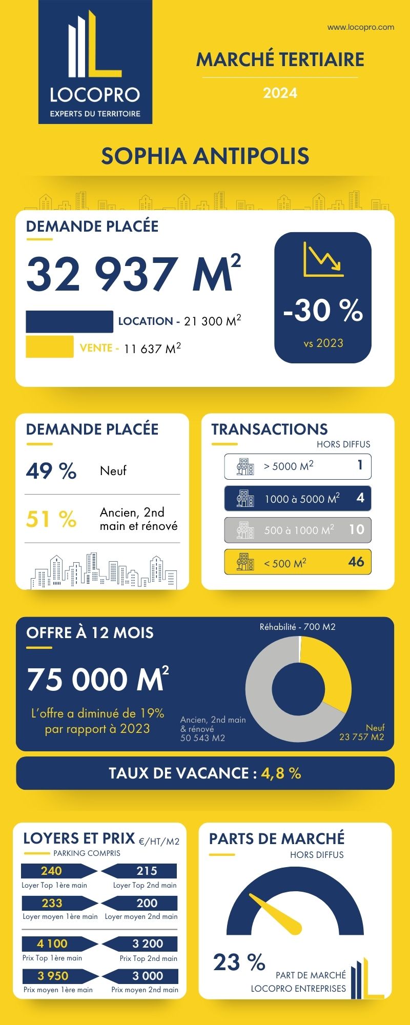 Challenger sur le marché des bureaux de Sophia Antipolis, nous continuons d'asseoir notre position en étant sur le podium avec 23% de part de marché.